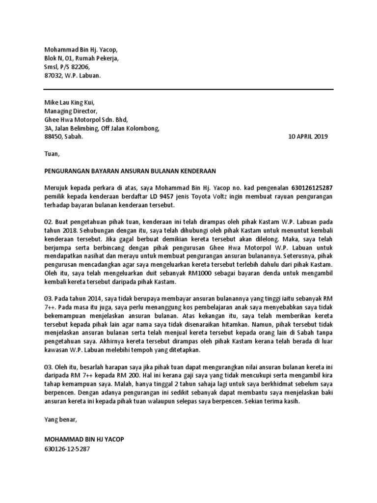 Contoh Surat Rayuan Pengurangan Bayaran Hutang Bulanan Ansuran Dan Lain Lain